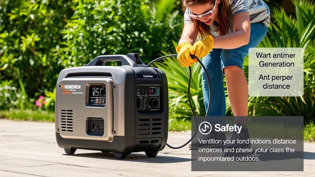 Did you know carbon monoxide poisoning causes around 430 deaths annually? To prevent it outdoors, I always make sure my generator is placed at least 20 feet away from my home and downwind. I never run it in enclosed spaces, and I keep an CO detector nearby. Proper placement and ventilation are key to staying safe and avoiding dangerous CO buildup when using a generator outside.