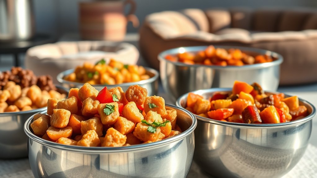 Ensuring my pet’s food offers complete and balanced nutrition is essential for their overall health. I look for brands that meet established standards, like those set by AAFCO, to confirm the food is formulated for maintenance, growth, or other specific needs. Checking ingredient labels helps me identify high-quality proteins, healthy fats, and fiber, while avoiding fillers, artificial preservatives, and low-nutrient additives. I also consider whether the food provides the right balance of macronutrients and micronutrients suited to my pet’s age, breed, and health conditions. Including natural ingredients and steering clear of artificial additives guarantees a nutritionally complete profile that supports their well-being. This careful approach helps me choose a gourmet food that truly nourishes my furry friend.