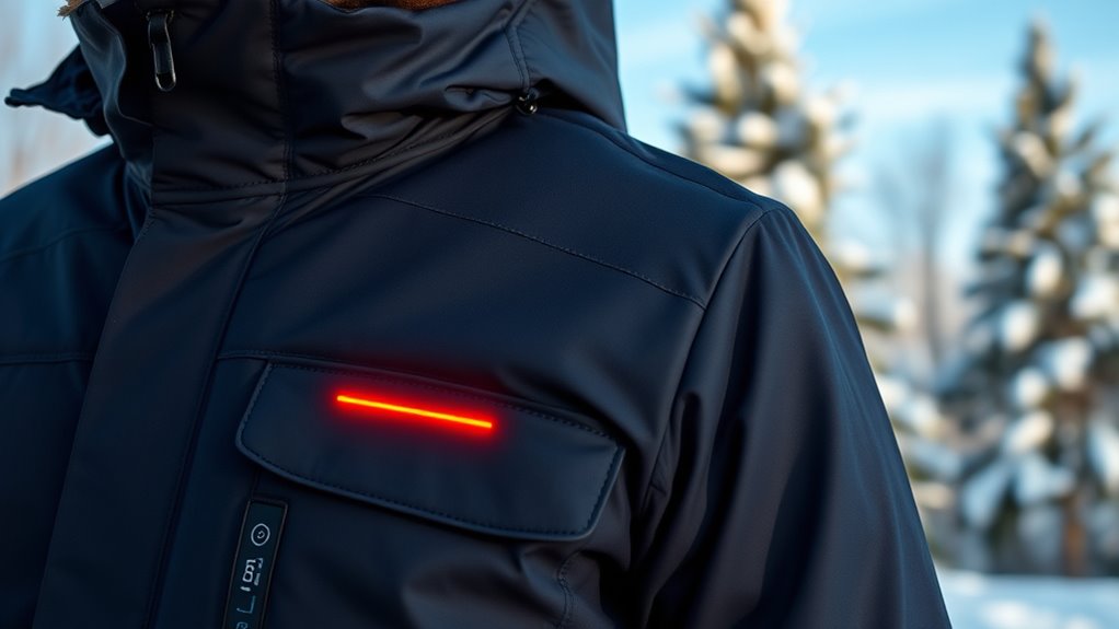 Selecting a heated jacket isn’t just about battery capacity; guaranteeing the battery is compatible with your clothing is equally vital. First, check that the battery voltage matches the jacket’s requirements, like 5V, 7.4V, or 12V, for ideal operation. Next, verify the connector type—whether it’s USB, DC, or a specialized port—to guarantee a secure fit. It’s also essential to confirm that the battery’s capacity and runtime suit your outdoor plans, especially in cold conditions. Additionally, some batteries are designed specifically for heated clothing, while others may need adapters or accessories. Finally, consider the battery’s size and weight to maintain comfort during extended wear. Proper compatibility ensures safety, efficiency, and a seamless experience when enjoying your heated jacket.
