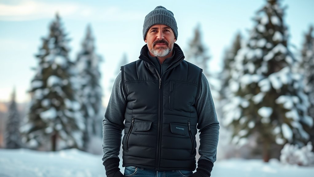 If you’re looking for the best heated vests for men in 2025, I recommend options with multiple heating zones, long-lasting batteries, and weatherproof designs. Models like the Rrtizan heated vest with a 12,000mAh battery or the ARRIS fleece vest combine warmth, comfort, and advanced features like zone controls and quick charging. These vests are perfect for outdoor activities or daily wear during winter. Stay tuned to find out which one suits your style and needs best.