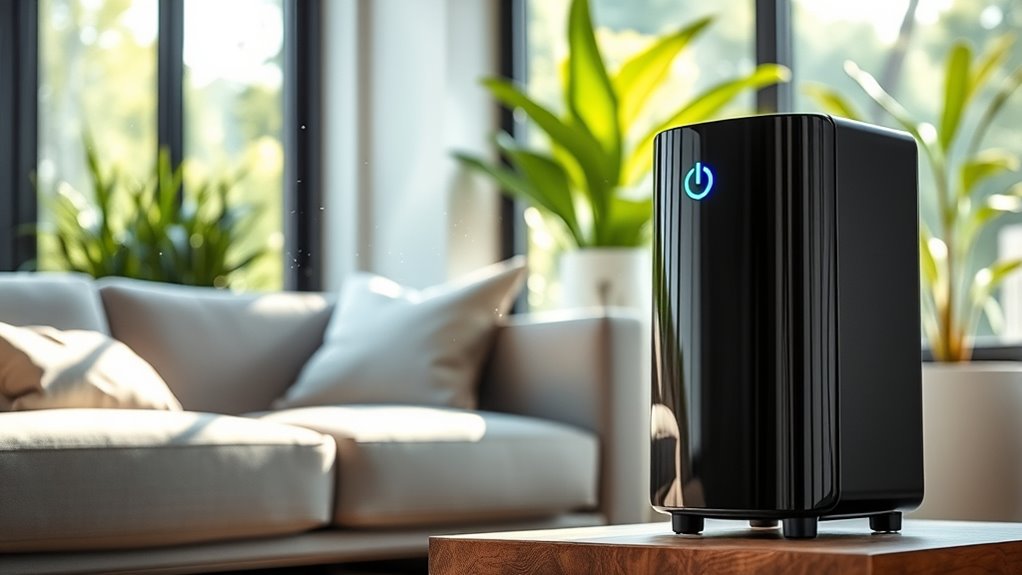 Since regular filter replacement is vital for maintaining your air purifier’s performance, it’s important to contemplate how often you’ll need to swap out the filters. HEPA filters usually last between 6 to 12 months, depending on usage and air quality. Some models have indicator lights or alerts that tell you when it’s time to change the filter, which simplifies maintenance. Using washable pre-filters can extend the lifespan of the main HEPA filter by trapping larger particles upfront. Regular replacement is essential to keep filtration efficient and prevent mold or bacteria buildup inside the filter. Always opt for manufacturer-approved or compatible filters to guarantee proper fit, safety, and peak performance of your purifier. Staying on top of filter needs helps your air stay clean and healthy.