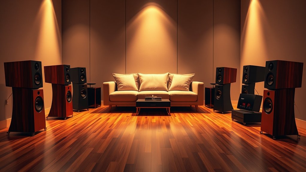 Different speaker configurations considerably influence sound quality and room acoustics. I find that stereo setups provide a balanced, immersive experience, while surround sound systems create a more dynamic, cinematic feel. The placement and number of speakers can reduce echo or dead spots, enhancing clarity. I always consider room size and shape, as these factors determine whether I need bookshelf, floor-standing, or in-wall speakers for ideal sound.
