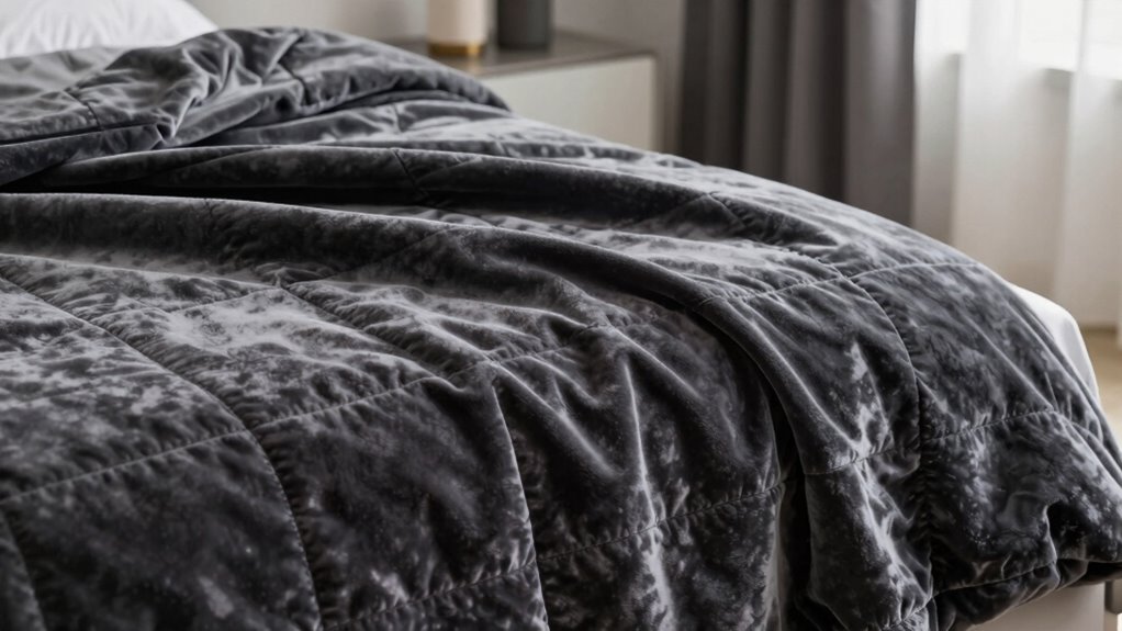 Material plays a big role in how durable and comfortable a weighted blanket is. I’ve found that natural fabrics like cotton or bamboo are breathable and soft, making them comfortable for all-night use. On the other hand, synthetic materials might last longer but can sometimes feel less cozy. So, I always check the material to guarantee it balances durability with comfort, depending on my preferences.