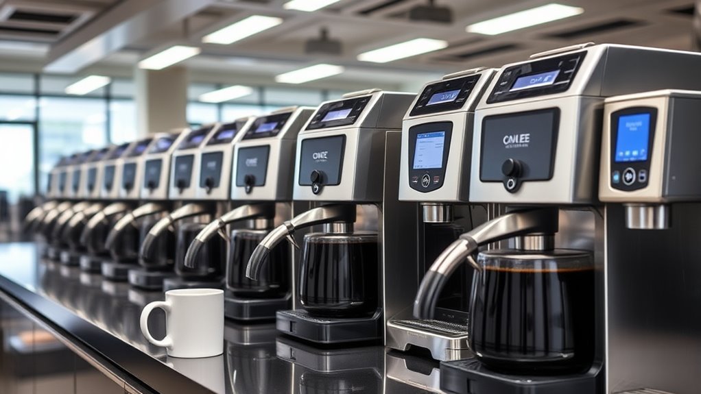 Choosing the right high-capacity drip coffee maker is like planting a sturdy tree—it’s about finding a reliable foundation that keeps your office energized. With the right brew, you’ll nurture productivity and camaraderie, ensuring the caffeine flows as freely as the connections you build. When you select a dependable machine, you’re not just brewing coffee; you’re cultivating a thriving workspace where ideas grow and spirits stay high.