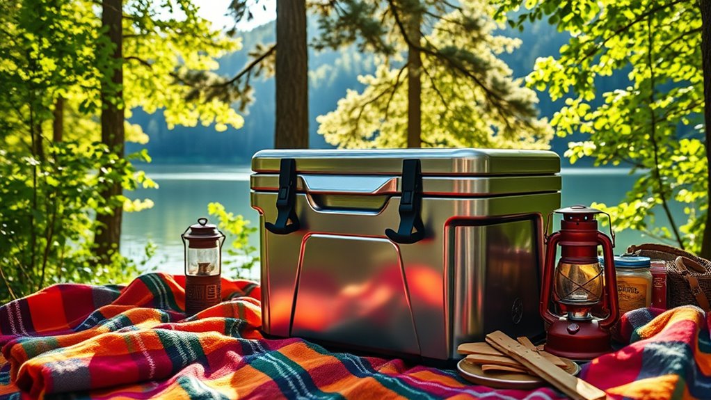 If you’re looking for the best high-end camping coolers to keep your food fresh and your trip cool, I’ve got you covered. From large-capacity models like Coleman’s 150-quart rolling cooler to durable options such as Ninja’s FrostVault 45QT, these coolers feature premium insulation, rugged construction, and mobility features like sturdy wheels and handles. They’re perfect for extended outdoor adventures and demanding conditions. Keep exploring to discover the top choices that combine performance, durability, and convenience for your next adventure.