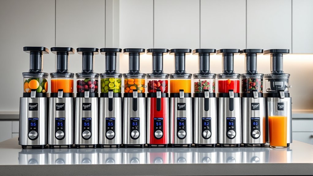 I understand you’re worried about energy use, but these top-tier juicers are surprisingly efficient. They’re designed with advanced motors that maximize juice extraction while consuming minimal power. I’ve seen how they can run smoothly without driving up your energy bills, so you can enjoy fresh, nutrient-packed juice guilt-free. Trust me, investing in a high-end juicer means better quality juice and energy savings—it’s a win-win!