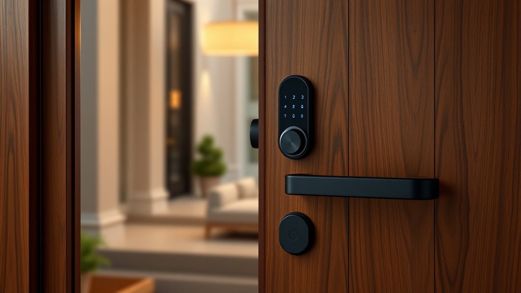 When it comes to smart door locks, their design and aesthetics play a significant role in enhancing your home’s overall look. High-end models often feature sleek, modern designs crafted from premium materials like aluminum or stainless steel, giving them a refined appearance. Finish options such as matte black, brushed nickel, or polished chrome allow you to match your lock seamlessly with your home’s exterior style. Some models include matching handles or handlesets, creating a unified, stylish look that also maintains security. Minimalist keypads with backlit or illuminated buttons add to their visual appeal and usability in low-light conditions. Overall, these locks prioritize both visual elegance and durability, ensuring your home’s entrance looks sophisticated while resisting weather and tampering.