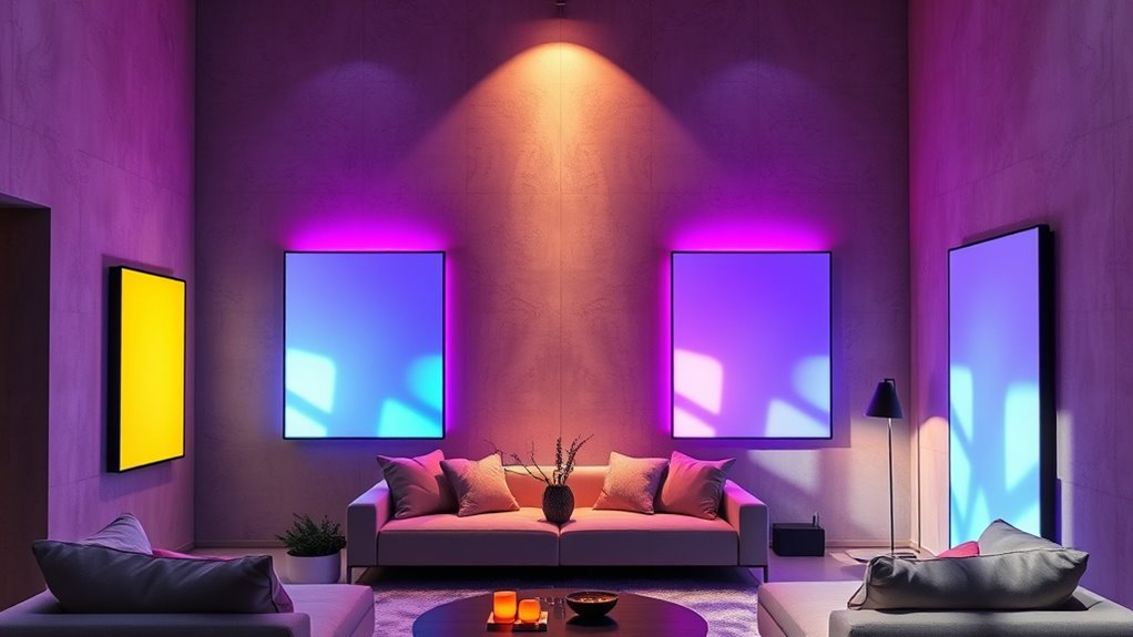 Choosing high-end smart light panels means paying close attention to their customization options, as these features considerably impact how well they suit your personal style and needs. I look for panels that offer millions of color options and advanced effects to craft the perfect atmosphere. Dynamic progressions, gradients, and programmable scenes help me set moods or match specific events effortlessly. Adjustable brightness, effect speed, and scheduling give me control over the ambiance throughout the day. Modular designs let me arrange panels in unique shapes, creating artistic displays or functional layouts that fit my space. Compatibility with mobile apps, voice assistants, and music synchronization enhances the level of personalization, making it easy to customize lighting on the fly and truly make my lighting system unique.