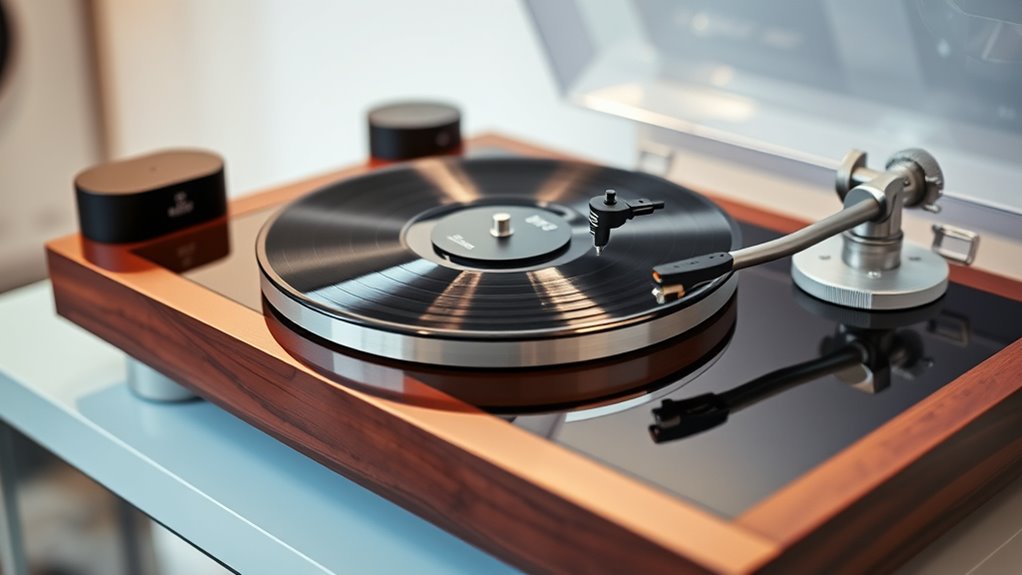 High-end models handle anti-vibration and resonance issues with advanced isolation techniques. I’ve noticed they often feature heavy, rigid plinths, sophisticated damping materials, and specialized feet that absorb external vibrations. Some also incorporate suspended decks or magnetic levitation systems to minimize resonance further. These design elements help me enjoy pure, clear sound without unwanted noise, ensuring that the music remains pristine and true to the original recording.