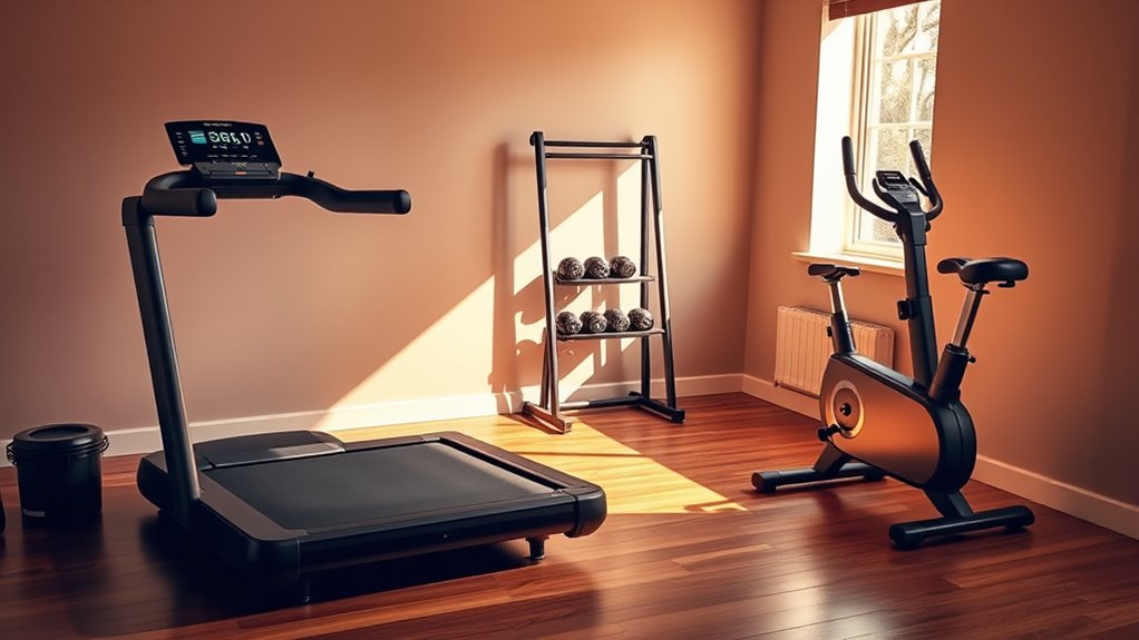 Choosing the right home workout equipment in 2025 requires careful consideration of space efficiency, especially if your area is limited. I recommend measuring your space accurately to ensure the equipment fits comfortably without overcrowding. Opt for foldable or compact designs, like foldable benches or collapsible resistance trainers, to save space when not in use. Multi-functional equipment that combines several workout options into one unit can reduce the need for multiple machines and help keep your area organized. Lightweight, portable devices such as resistance bands or compact rowers are easy to store and move around. Additionally, prioritize equipment with adjustable features that can be customized to your needs and stored efficiently. These choices guarantee you maximize your space while maintaining an effective workout setup.