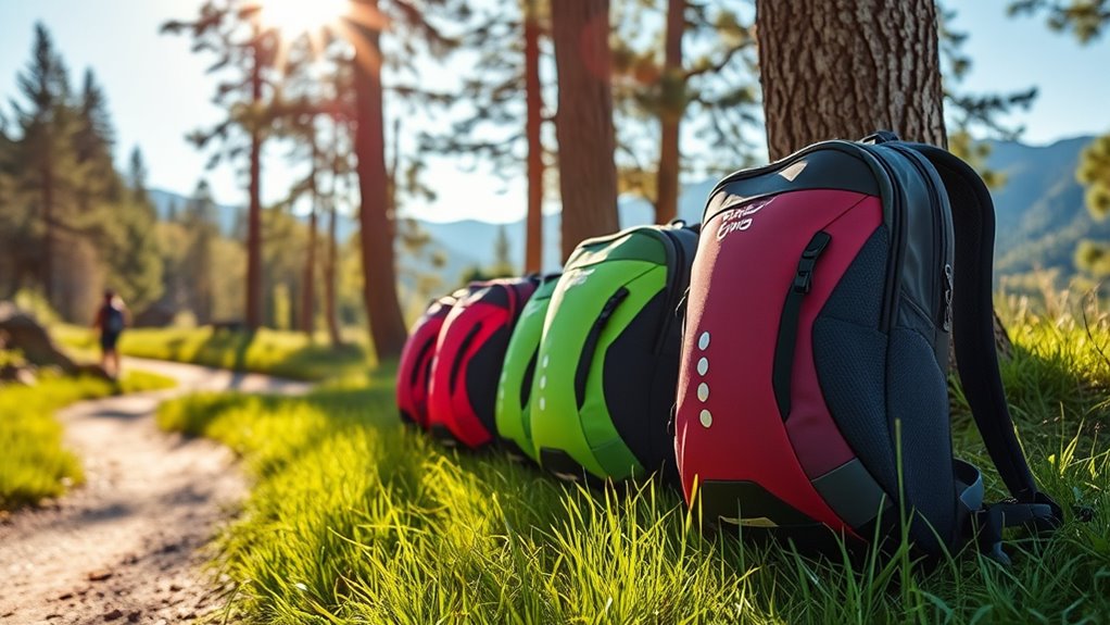 Selecting the right hydration backpack involves balancing weight and size to guarantee comfort and performance. Lighter packs, around 8.5 ounces, are easier to carry during long runs, while heavier options over a kilogram provide more storage and hydration capacity. For short activities, smaller packs with 1.5 to 2 liters are ideal—they’re lightweight and less cumbersome. Larger packs with 3 liters or more increase weight but suit extended outings. Materials like ripstop nylon, mesh, and TPU help keep weight down without sacrificing durability. The size of the pack also affects mobility; a compact design reduces bulk and wind resistance, which is vital when running fast. Adjustable straps and ergonomic shapes help evenly distribute weight, preventing strain and enhancing comfort over time.