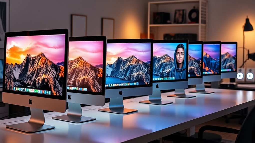 If you’re looking for the best iMacs for photographers in 2025, I recommend models with stunning displays like the 24-inch Retina with 4.5K resolution and P3 color support. Power is key, so the M4 chip with a 10-core CPU and ample memory guarantees smooth editing. Their sleek, colorful designs add personality to your workspace. To discover the top six options and find the perfect fit, keep exploring these premier choices.
