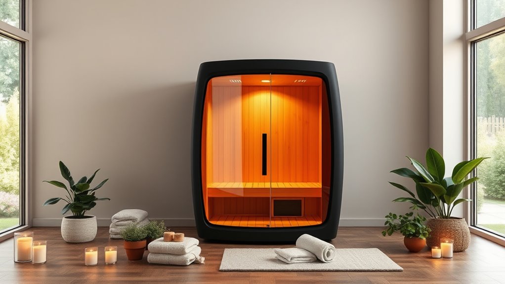 Adding extra wellness features to a portable infrared sauna can substantially enhance your relaxation and health benefits. Many models include red light therapy, often at 660nm or 850nm wavelengths, to boost muscle recovery, skin health, and stress relief. Features like chromotherapy lighting, aromatherapy compatibility, and built-in speakers create a more immersive experience. Some saunas also offer heated footpads, adjustable temperature zones, and remote controls, allowing you to customize your session for maximum comfort. These added features can improve circulation, accelerate metabolism, and speed up detoxification, making your at-home spa more effective. Choosing a sauna with multiple wellness options helps tailor your experience to your specific needs, delivering a more personalized, exhaustive approach to relaxation and overall wellness.