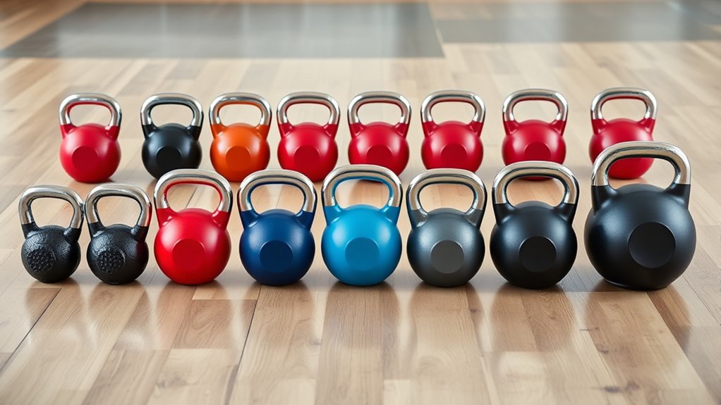 Comfortable grip and thoughtful handle design are essential for an enjoyable and effective workout with adjustable kettlebells. An ergonomic handle with a wider, taller shape can markedly reduce hand fatigue and improve grip comfort, especially during longer sessions. Handles coated with non-slip materials like rubber or textured PE ensure a secure grip—even when your hands sweat or during intense exercises. The handle’s diameter, typically between 28mm and 35mm, influences how much grip strength is needed; larger sizes offer better control but require more grip strength. A smooth, rounded handle with minimal sharp edges helps prevent blisters and skin irritation, making workouts more comfortable. Additionally, user-friendly handles that are easy to grip allow quick weight changes without compromising stability or comfort.