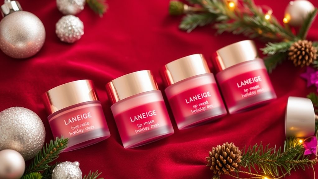 Selecting a Laneige lip mask holiday set with the right ingredients guarantees your lips stay hydrated and healthy. Look for masks with moisturizing ingredients like hyaluronic acid, vitamin C, or plant extracts to guarantee effective hydration. Nourishing components such as shea butter, coconut oil, and avocado oil help repair and soften dry, chapped lips. Antioxidants like vitamin C protect against environmental damage and support a vibrant, healthy appearance. Natural extracts, including fruit or botanical components, offer gentle soothing benefits without irritation. If you have sensitive lips, choose formulations with mild, non-irritating ingredients to ensure comfort and safety. Prioritizing these beneficial ingredients ensures you pick a set that truly nourishes and maintains your lips’ health during the holiday season.