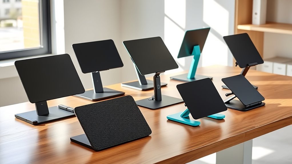 Think of a lapstand as a sturdy bridge supporting your work—material choice is vital. I’ve found that metal frames, especially aluminum, offer excellent durability and stability due to their strength and lightweight nature. High-quality plastics with reinforced cores also work well, providing resilience without adding bulk. Ultimately, materials that resist wear, withstand weight, and prevent wobbling ensure your lapstand remains a reliable tool for productivity and comfort.