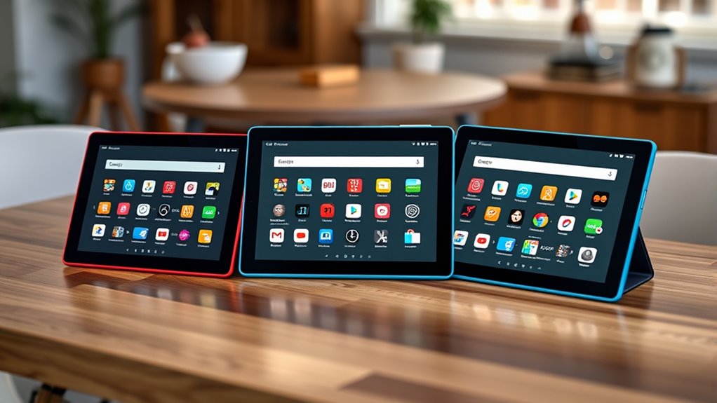 Choosing the right Fire tablet starts with understanding its display size and quality. Fire tablets range from 7 to 11 inches, so you can pick one that balances portability with viewing comfort. Higher resolution screens, like 1080p Full HD, deliver sharper visuals, making streaming, reading, and browsing more vibrant and detailed. IPS technology guarantees wide viewing angles and consistent color accuracy, so the display looks good from any position. Blue light certification helps reduce eye strain during long sessions, especially on larger, brighter screens. Keep in mind that pixel density (PPI) varies with size and resolution, affecting how crisp images and text appear. Selecting the right display depends on your preferred size and how important visual clarity is to your daily use.