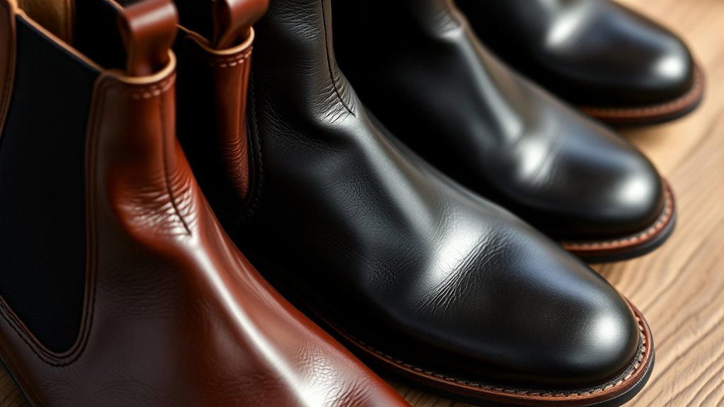 Choosing the right leather Chelsea boots hinges on understanding material quality and durability, as these factors determine how well the boots will stand up to daily wear. High-quality leather like full-grain or top-grain is essential because it offers superior resistance to scuffs and develops a rich patina over time. The thickness and density of the leather also matter—thicker leathers provide better protection and structural integrity, extending the boots’ lifespan. Proper craftsmanship, including reinforced stitching and quality lining, further boosts durability. Sourcing leather from reputable tanneries guarantees responsible practices and consistent quality. Additionally, regular maintenance, such as conditioning and waterproofing, helps preserve the leather’s strength and appearance, ensuring your boots last for years while staying stylish and functional.