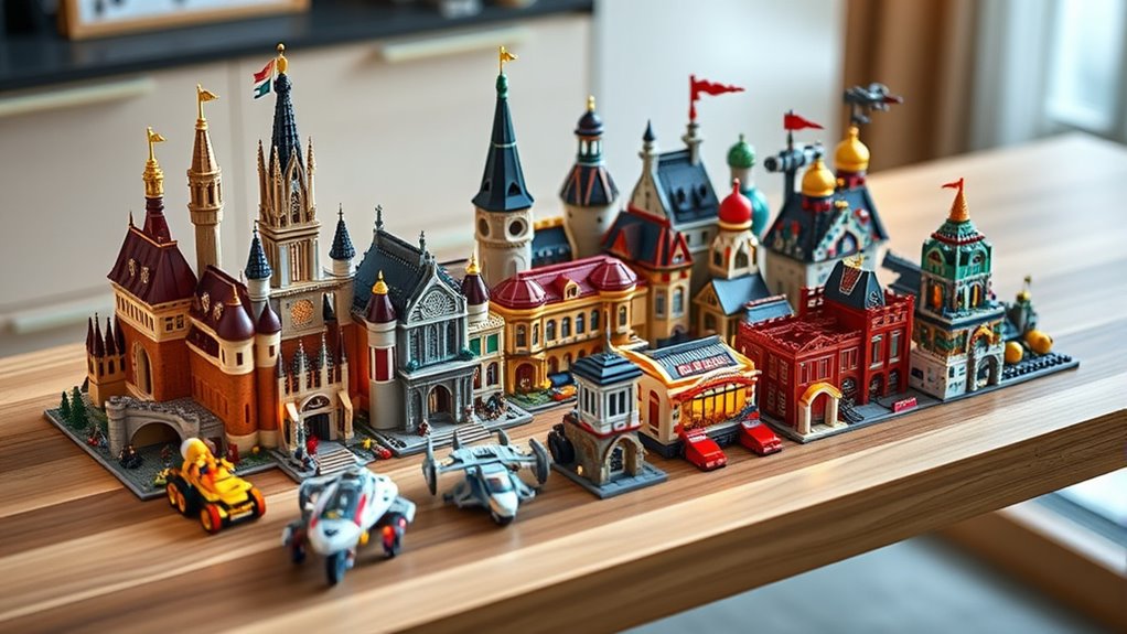 If you’re looking to boost a LEGO set’s long-term value, paying attention to its collectibility potential is key. Sets with limited editions or special anniversary themes tend to appreciate over time, making them great investments. Larger, more detailed models with unique pieces also attract collectors, especially if they stand out visually. Including exclusive minifigures or rare accessories can markedly increase a set’s desirability and future worth. Compatibility with digital apps or display accessories adds another layer of appeal for dedicated collectors who want versatility. Additionally, sets that are discontinued or hard to find naturally carry higher rarity, boosting their collectible status. Considering these factors can help you choose sets that not only inspire creativity now but also hold value long-term.
