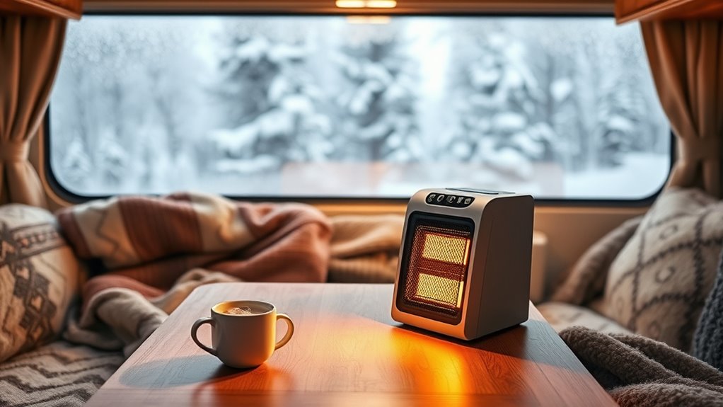 If you’re looking for low-watt heaters to keep your RV cozy this winter without overloading your power supply, I’ve found some great options. Compact, lightweight designs with safety features like tip-over protection and adjustable thermostats are ideal. Models with ceramic or infrared technology heat efficiently while staying energy-friendly. To stay safe and warm, consider features like timers and remote controls. Keep exploring to find the perfect heater that balances power use and warmth for your RV.