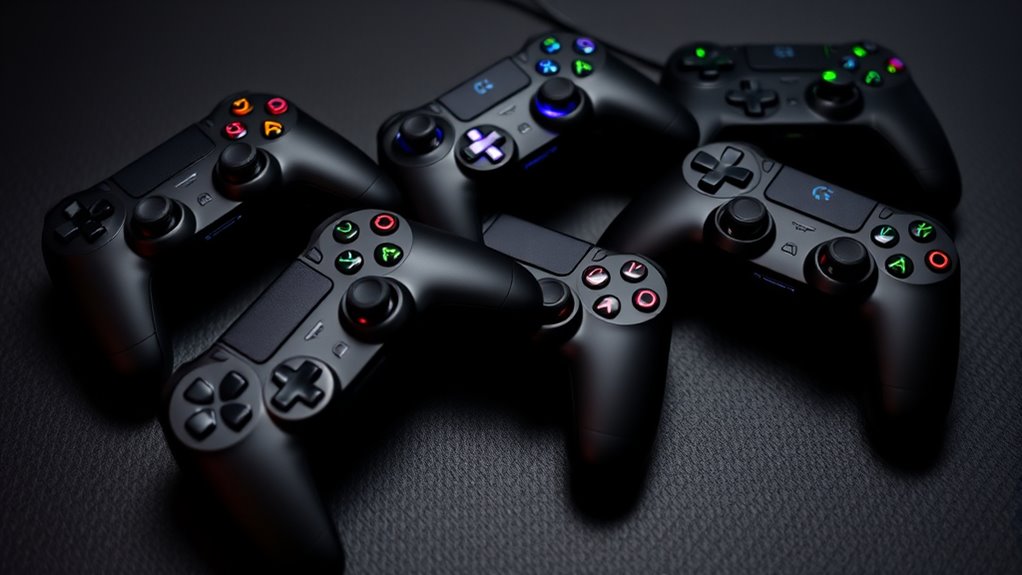 A controller’s ergonomic design considerably impacts comfort during long gaming sessions, helping prevent hand fatigue and discomfort. I look for controllers with a comfortable grip that feels natural in my hands, reducing strain over time. Features like textured grips and contoured shapes make a noticeable difference, providing better control and comfort. Adjustable trigger and thumbstick sensitivity also enhance the experience by allowing personalized settings that suit my playstyle. Proper weight distribution and a balanced design are essential to prevent wrist strain and fatigue, especially during extended play. A lightweight yet sturdy build ensures durability without sacrificing ease of handling. These ergonomic features contribute markedly to a more comfortable, enjoyable gaming experience, especially during those marathon sessions.