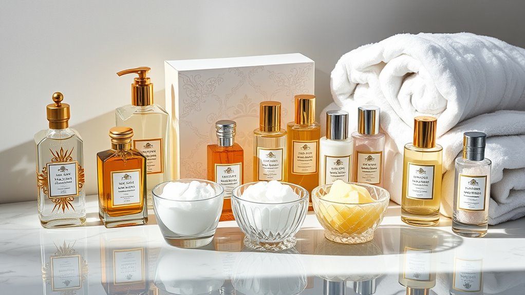 Choosing luxury bath oil and salt gift sets with high-quality ingredients starts with paying close attention to their composition. I look for products made with natural, organic, and ethically sourced ingredients to guarantee safety and effectiveness. It’s important to avoid synthetic additives, parabens, phthalates, and artificial fragrances, which can irritate the skin and harm the environment. Premium ingredients like essential oils, shea butter, jojoba oil, and mineral-rich salts offer therapeutic benefits and nourish the skin deeply. Certifications such as organic, vegan, cruelty-free, or allergen-free labels help verify ingredient integrity. Transparency in sourcing and detailed labels give me confidence in the product’s authenticity and quality. Choosing sets with these standards ensures a luxurious, safe, and environmentally responsible indulgence.