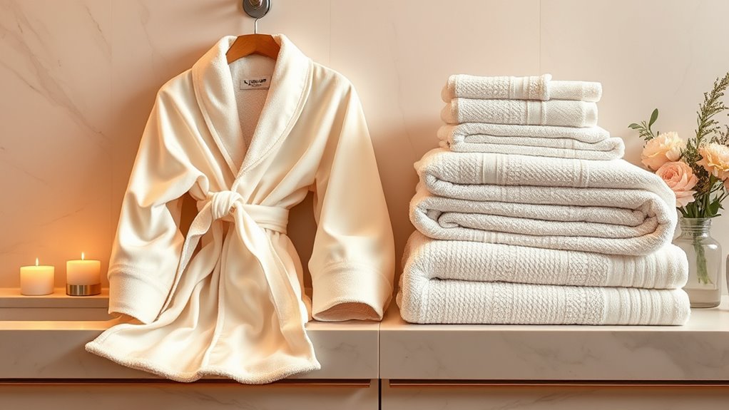 I believe the best materials for luxury bathrobes and towels are plush cotton, Egyptian cotton, and bamboo. These fabrics feel incredibly soft against the skin and are highly absorbent, making your spa experience even more indulgent. I personally prefer Egyptian cotton for its durability and luxurious feel, while bamboo offers eco-friendly benefits. Whatever you choose, guarantee it’s high-quality for that truly plush, spa-like experience.