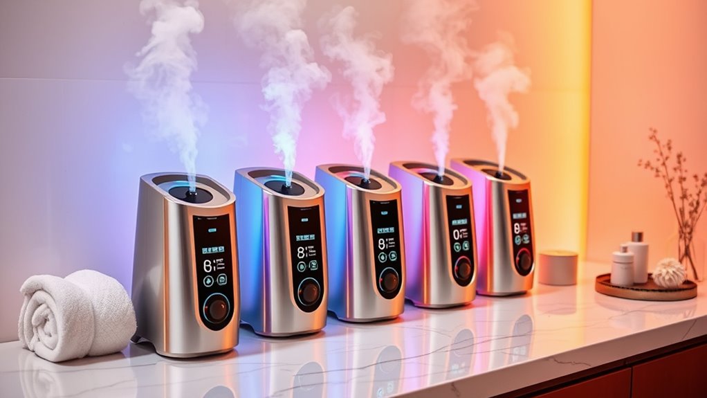 Ever wondered what makes a luxury facial steamer truly effective? It’s all about steam quality and intensity. A top-quality steamer produces a fine, steady mist at a consistent temperature, helping to open pores and thoroughly cleanse your skin. Adjustable intensity controls are essential—they let you customize the steam flow based on your skin type and treatment needs. High-pressure steam boosts product penetration and treatment results, making the experience more effective. The heating system’s capacity and speed determine steam stability and safety, ensuring the right temperature without discomfort. Additionally, features like ozone or aromatherapy options can enhance steam purity and add therapeutic benefits. Overall, the perfect balance of steam quality and intensity elevates your skincare routine, delivering visible, radiant results.