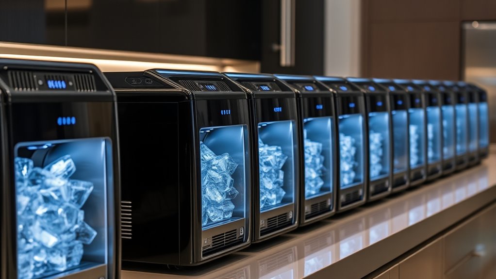 Luxury ice machines can be surprisingly energy-efficient and quiet—or loud and power-hungry—depending on the model. Some use cutting-edge technology to sip power and hush noise, making them nearly invisible in your kitchen symphony. Others might roar like a beast, draining energy like a hurricane. I recommend checking specs carefully, because selecting a model with low noise and energy use can transform your ice-making experience from a headache to pure bliss.