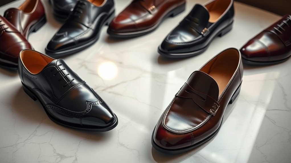 Durability and proper maintenance are essential factors when investing in luxury men’s dress shoes, as they considerably influence how long your shoes will last and look their best. High-quality leather and reinforced stitching make these shoes resilient against regular wear, while finishes like patent leather or water-repellent coatings safeguard against moisture and scuffs. Choosing shoes with solid construction features like Goodyear welt or Blake stitch allows for easier resoling and repairs, extending their lifespan. Regular cleaning, polishing, and storing shoes with shoe trees help preserve their appearance and prevent creasing. Routine inspections for signs of wear, such as thinning soles or creasing, enable timely repairs that maintain structural integrity. Proper care ensures your luxury shoes stay elegant and durable for years to come.