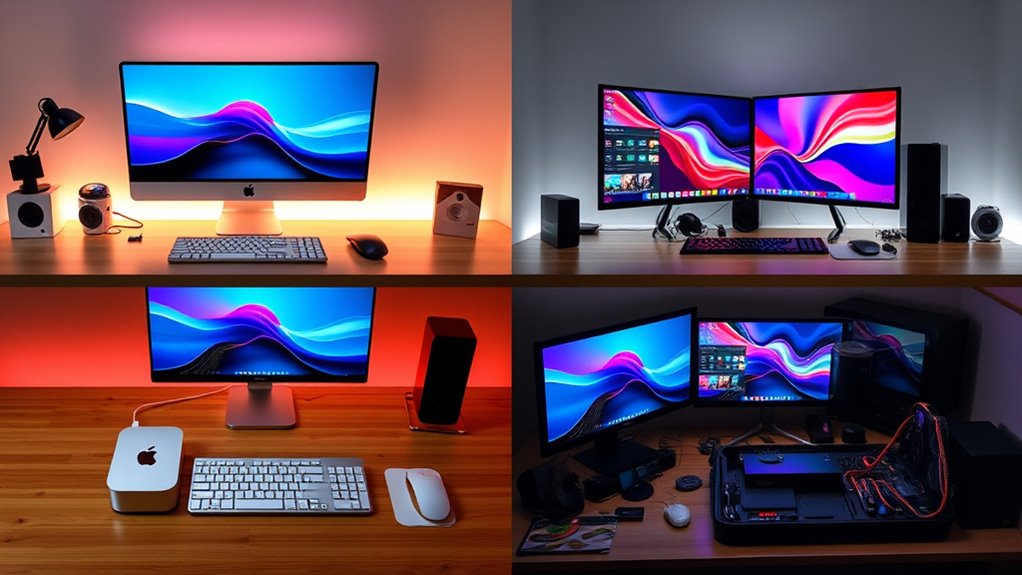 If you’re a creator in 2025, I recommend choosing between the Mac mini (2024) with M4 or M4 Pro chips, based on your workload. For moderate tasks like editing or multitasking, the base M4 model offers great value. If you handle demanding projects like 8K video or 3D rendering, the M4 Pro with higher RAM and GPU power is ideal. Keep in mind storage, display needs, and connectivity—these details will help you find the perfect fit. If you want all the details, continue exploring.