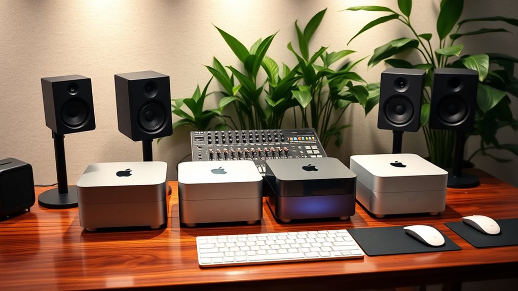 If you’re choosing the best Mac mini models for your home studio in 2025, I recommend looking at the latest M4 and M4 Pro versions. They offer powerful processors, ample memory, and support for multiple high-res displays. The small, quiet design makes them perfect for tight studio spaces. While internal storage can be limited, external drives can help. Keep exploring, and you’ll find the right model that balances performance, space, and future-proofing for your creative needs.