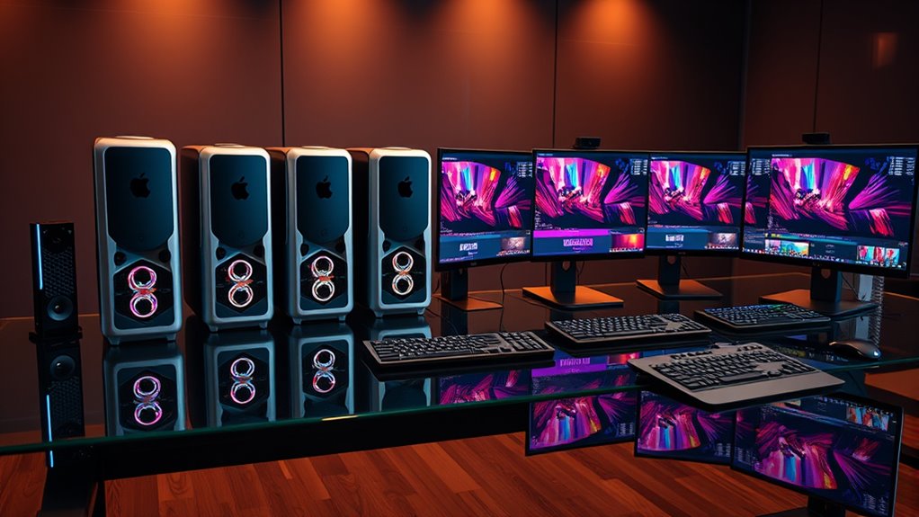 A powerful GPU is indispensable for professional video post-production, as it directly influences rendering speeds, real-time playback, and the ability to work with high-resolution footage. Hardware-accelerated ray tracing can considerably cut rendering times, making complex visual effects more manageable. The number of GPU cores impacts how smoothly you can edit 8K or RAW footage without lag. VRAM capacity and memory bandwidth are essential for handling large textures and intricate effects without bottlenecks. Multiple GPU configurations or dedicated GPU cards can boost rendering performance and support multi-stream editing. Compatibility with professional editing software is also key; your GPU needs to meet or surpass recommended hardware acceleration standards to guarantee seamless, efficient workflows. Choosing a Mac Pro with robust GPU performance is critical for top-tier post-production work.