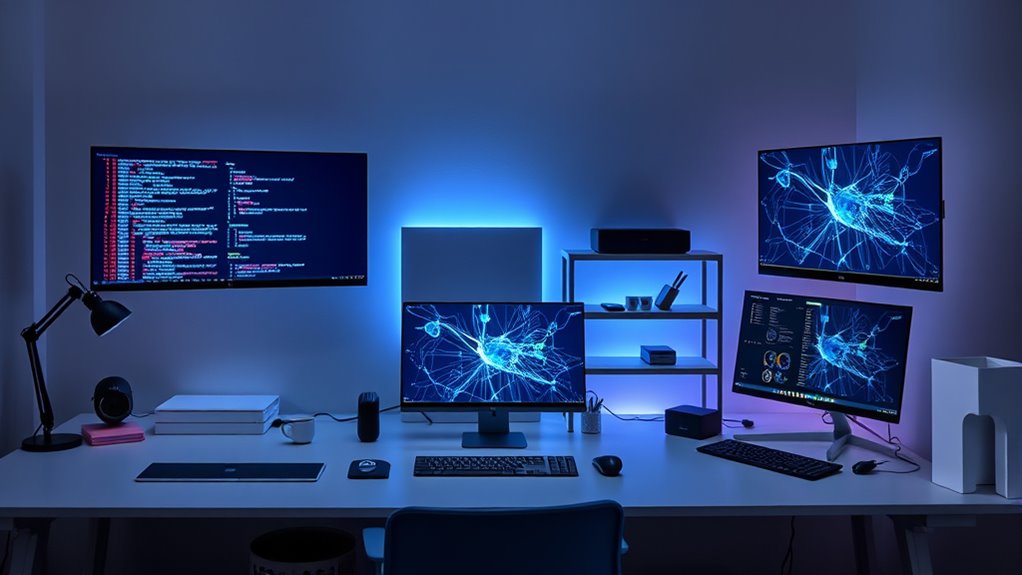 Choosing a Mac Studio for machine learning means ensuring it supports the frameworks and tools I rely on daily. I look for hardware acceleration features like Metal or CUDA equivalents to speed up processing. A powerful GPU, such as the 10-core GPU in M4 chips or higher, is vital for GPU-accelerated libraries like TensorFlow and PyTorch. Compatibility with macOS is also essential; updates should optimize popular ML frameworks for Apple Silicon architecture. Native support for hardware-accelerated decoding engines, like ProRes or AV1, helps improve data preprocessing workflows. Additionally, having at least 16GB of unified memory allows me to run large models smoothly within these frameworks. Ensuring these factors guarantees the Mac Studio can handle my machine learning tasks efficiently and seamlessly.