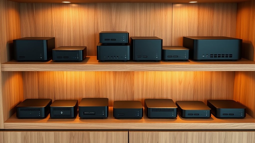 If you’re looking for the best mini PCs for your home theater in 2025, I’ve found some great options. From compact devices with powerful Intel or AMD CPUs to models supporting 4K and even 8K displays, these mini PCs offer excellent performance, ample storage, and versatile connectivity. They’re perfect for streaming, gaming, or media servers, all while saving space. Keep exploring to discover the top features that make these tiny powerhouses ideal for your setup.