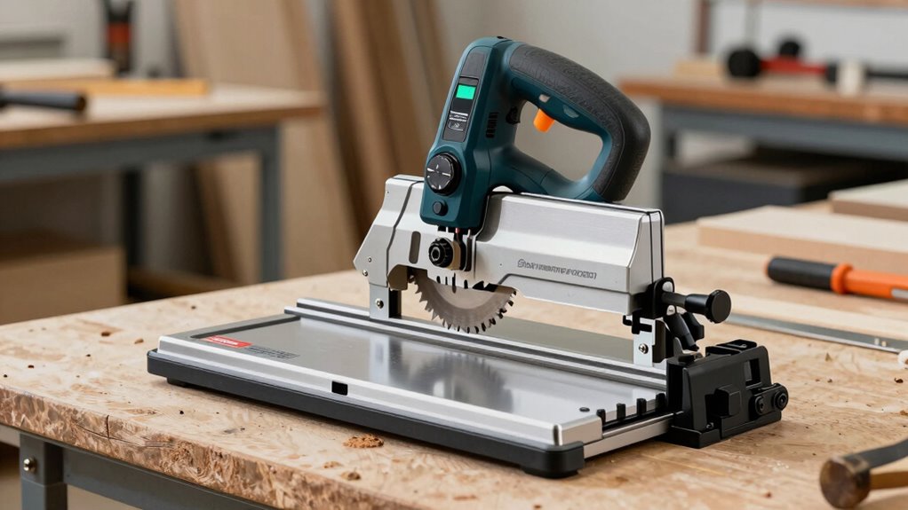 Choosing a portable miter saw is essential for making your work easier and more efficient, especially on busy job sites or in small workshops. A lightweight design, under 50 pounds, makes it simple to transport and reposition. Compact features like foldable or sliding fences help conserve space when the saw isn’t in use. Built-in carrying handles and ergonomic grips ensure safe, comfortable carrying. A modular or removable extension table allows for quick setup and easy storage. Additionally, a dual-bevel sliding miter saw with a small footprint fits well in tight spaces or tool cabinets, maximizing your workspace. Prioritizing portability and storage means you can move your saw effortlessly and keep your workshop organized, saving time and reducing fatigue during long projects.