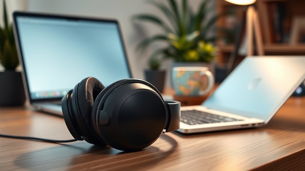 When choosing noise-canceling headphones for remote work, microphone clarity is crucial for ensuring your voice comes through loud and clear during calls. A high-quality microphone can reduce background noise by up to 99%, making your speech more intelligible even in noisy environments. Microphone sensitivity and frequency response play a fundamental role in delivering clear audio; larger drivers, like 40mm ones, often produce richer sound quality. Features such as 270° rotatable or flip-to-mute microphones provide flexibility for positioning and quick muting, enhancing privacy. AI noise cancellation technology further filters ambient sounds like keyboard clicks, fan noise, and chatter, improving overall call quality. Clear microphone performance is essential for effective communication, especially when working in open-office setups or noisy surroundings.