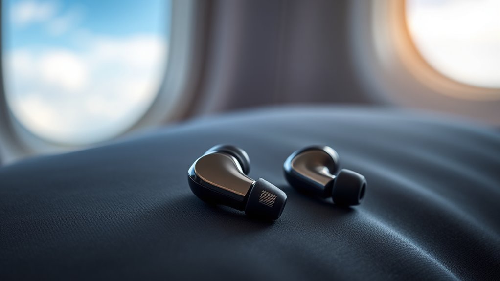 The effectiveness of noise cancellation in earbuds largely depends on the decibel reduction they can deliver, with higher dB levels offering better suppression of ambient sounds. Active Noise Cancellation (ANC) typically blocks between 20 to 30 dB of noise, which is effective for reducing engine hum and cabin chatter during flights. However, its performance varies with sound frequency—ANC works better on low-frequency noises like engine noise than on high-frequency sounds such as crying babies or chatter. Some earbuds have adaptive ANC that detects external sounds and adjusts in real-time for ideal performance. Additionally, the fit and seal of the earbuds are vital; a snug, customizable fit enhances noise cancellation by creating a proper seal, ensuring you get the most out of the technology.