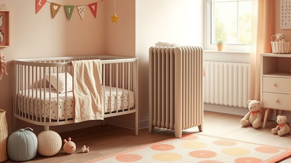 Since oil-filled radiators operate silently without fans or moving parts, they are particularly well-suited for nurseries where a peaceful environment is essential. Their noise levels are usually below 30 decibels, comparable to a whisper or rustling leaves, which helps prevent disturbances during sleep or playtime. Any clicking or ticking sounds are typically due to thermal expansion or safety features activating, not operational noise. To guarantee minimal disruption, it’s best to choose models with explicitly listed noise ratings. This way, you can confidently select a radiator that maintains a tranquil nursery atmosphere. Keeping noise levels low is vital for your little one’s comfort and restful environment, making this an important factor in your decision-making process.