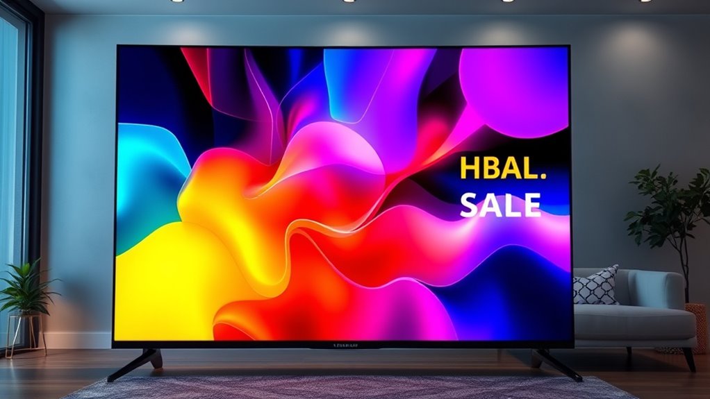 Choosing the right screen size for an OLED TV can considerably enhance your viewing experience, especially during Cyber Monday deals when discounts make upgrades more affordable. Available sizes typically range from 55 to 65 inches, so consider your space and preferences. Larger screens, like 65 inches, offer a more immersive experience but need more room and a bigger budget. Smaller options, such as 55 inches, are ideal for compact spaces or wall mounting, providing flexibility without sacrificing picture quality. Keep in mind the distance from your seating area; a good rule is to sit about 1.5 to 2.5 times the TV’s diagonal size for ideal viewing. Cyber Monday deals often feature various sizes, making it an excellent time to choose the perfect screen size while saving considerably.