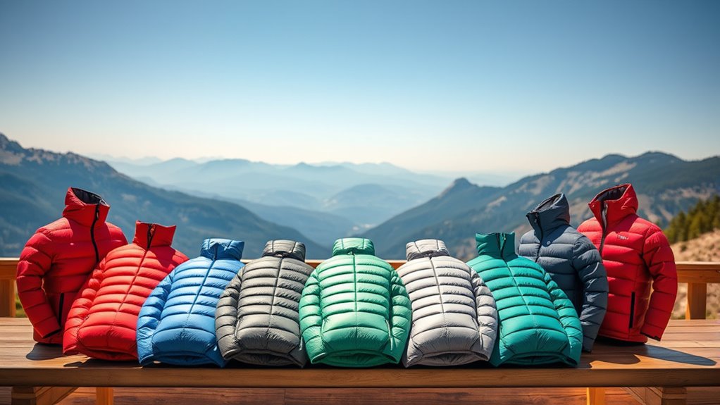Lightweight down jackets are designed to be easy to carry and store, making them perfect for travel and outdoor adventures. Most weigh less than 12 ounces, so they won’t add much bulk to your pack. Packability is key—some jackets fold into their own pouch, shrinking to the size of a water bottle, thanks to ultra-lightweight materials like nylon or polyester. Minimal bulk and low-profile insulation help maintain warmth without sacrificing portability. A truly packable jacket should fit easily into a daypack or carry-on luggage, ensuring you can bring it along without hassle. The goal is to find a balance between lightness and compactness, so you’re prepared for changing weather without sacrificing space or comfort during your trip.