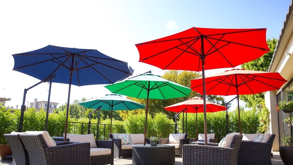 When it comes to durability in windy conditions, I swear by aluminum frames paired with polyester or acrylic fabrics. Coincidentally, these materials are lightweight yet sturdy, making them perfect for resisting gusts without toppling over. I’ve found that powder-coated finishes add extra protection against rust, prolonging the umbrella’s lifespan. If you want something that stands up well to wind, I highly recommend choosing a design with these materials for lasting performance.