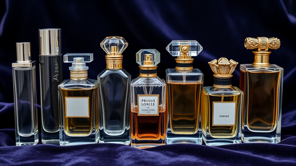 Understanding fragrance notes is essential because they reveal how a perfume evolves over time and how it will interact with your skin. Fragrance notes are divided into top, middle, and base notes, each playing a role in the scent’s development. Top notes are the first impression—light, fresh, and volatile, like citrus or herbal scents. Middle notes form the core of the perfume, often including florals such as jasmine or rose, which define the character. Base notes add depth and longevity, with warm, rich ingredients like vanilla, musk, or sandalwood. Choosing the right fragrance type—floral, fruity, oriental, or woody—helps evoke specific moods and suits different occasions. Considering these notes and types guarantees you find a perfume that resonates with your personality and style.