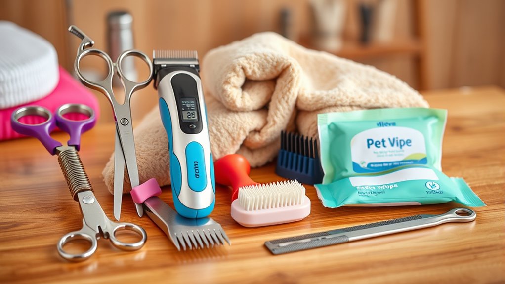 Choosing the right grooming tools depends heavily on your pet’s coat type, as different textures and lengths demand specific equipment for effective care. For short-haired pets, fine-tooth combs and slicker brushes work best to remove loose hair and prevent matting. Long-haired or thick coats need dematting tools, wider-tooth brushes, and thinning shears to manage tangles and avoid discomfort. Pets with wiry or double coats benefit from specialized deshedding tools that reach the undercoat without damaging the topcoat. Recognizing your pet’s coat type helps you select tools that effectively remove loose hair, reduce shedding, and keep their coat healthy. Using the right tools tailored to your pet’s coat ensures grooming is efficient, comfortable, and beneficial for their overall coat condition.