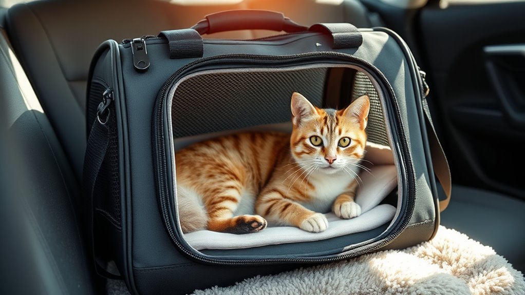 I make sure my pet’s safety during transit by choosing a carrier with secure fastenings and proper ventilation. I place familiar items inside for comfort and always double-check that the carrier is stable and well-ventilated. During travel, I avoid sudden stops and rough roads to prevent jostling. I also keep an eye on my pet, ensuring they’re calm and comfortable throughout the journey.