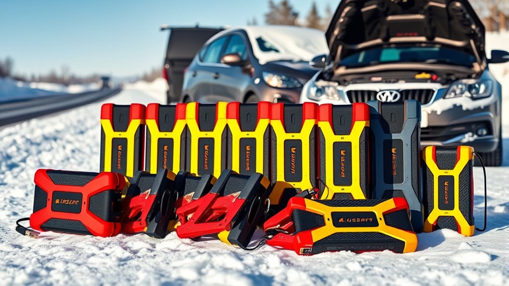 Ensuring your jump starter can withstand winter conditions means paying attention to durability and weatherproofing. I look for models rated for extreme temperatures, capable of working reliably from -4°F to 140°F. Durability is essential, so I prefer devices with reinforced shockproof or flame-retardant casings to handle harsh environments. Weatherproof or IP-rated protection against dust, water, and snow is a must to prevent damage during winter use. A robust battery management system (BMS) offers protection against short circuits, overcurrent, and overheating, especially in cold weather. I also check that cables and connectors are durable and resistant to cracking or freezing. These features ensure the jump starter remains functional and reliable when I need it most, even in tough winter conditions.