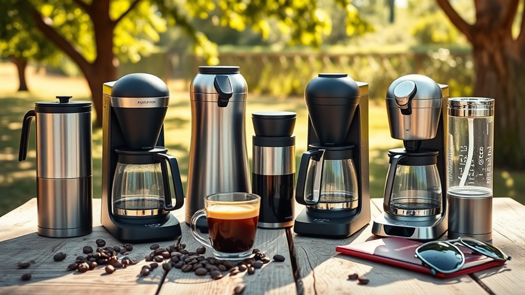If you’re like me, finding a reliable portable espresso maker makes all the difference on the go. Imagine waking up during a camping trip and brewing that perfect shot without bulky equipment—like Sarah, who used her Nano Portable Espresso Machine on a weekend getaway and loved every sip. Whether you’re camping, traveling, or at the office, choosing the right compact espresso maker guarantees you get your caffeine fix anytime, anywhere. Happy brewing!