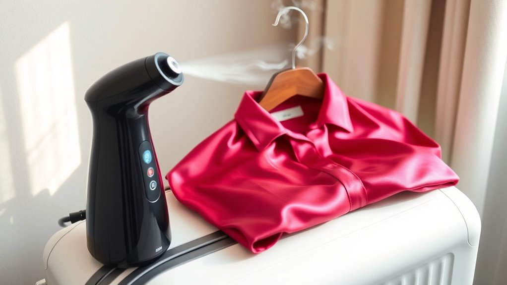 A stitch in time saves nine, and that’s true for delicate fabrics too. I’ve found that most portable steamers are safe on delicate textiles when used properly—just keep the steam at a gentle setting and avoid direct contact with fragile fibers. Always check the manufacturer’s instructions first. I recommend testing on a small, hidden area before steaming your entire garment to ensure safety and avoid any mishaps.