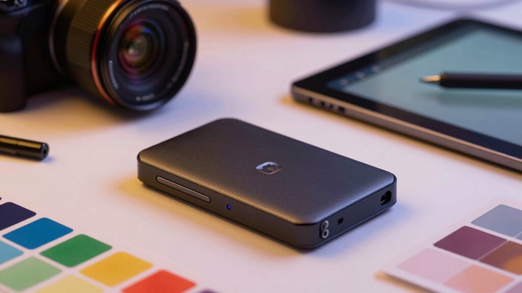 When choosing a portable SSD, I focus on transfer speeds to guarantee quick workflow, along with durability to withstand daily use. Compatibility with my devices and security features are also key factors that influence my decision. Finally, I consider storage capacity and data protection options to keep my work safe and accessible.