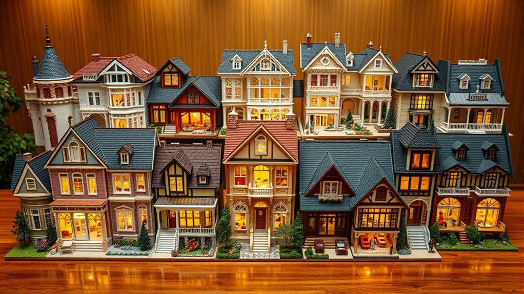 Premium dollhouses typically meet strict safety standards like ASTM F963 and EN71, ensuring they’re safe for children. I always check for non-toxic paints, smooth edges, and sturdy construction to prevent accidents. Manufacturers often include safety certifications on packaging, which I look for before purchasing. These standards help me feel confident that the dollhouse is safe for kids and collectors alike, giving peace of mind during play or display.